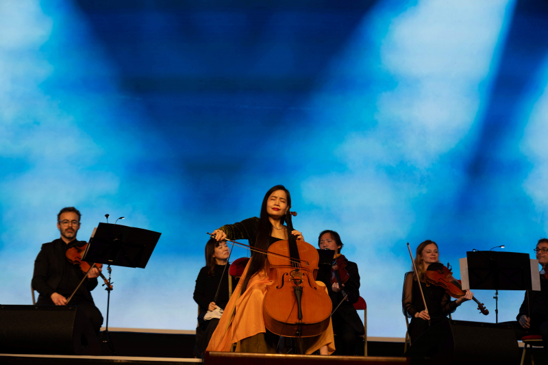 Cellist Đinh Hoài Xuân and the Orchestre national de France perform during the mini-concert prior to the screening of the film Dogfight in the Sky (“Tử chiến trên không”).