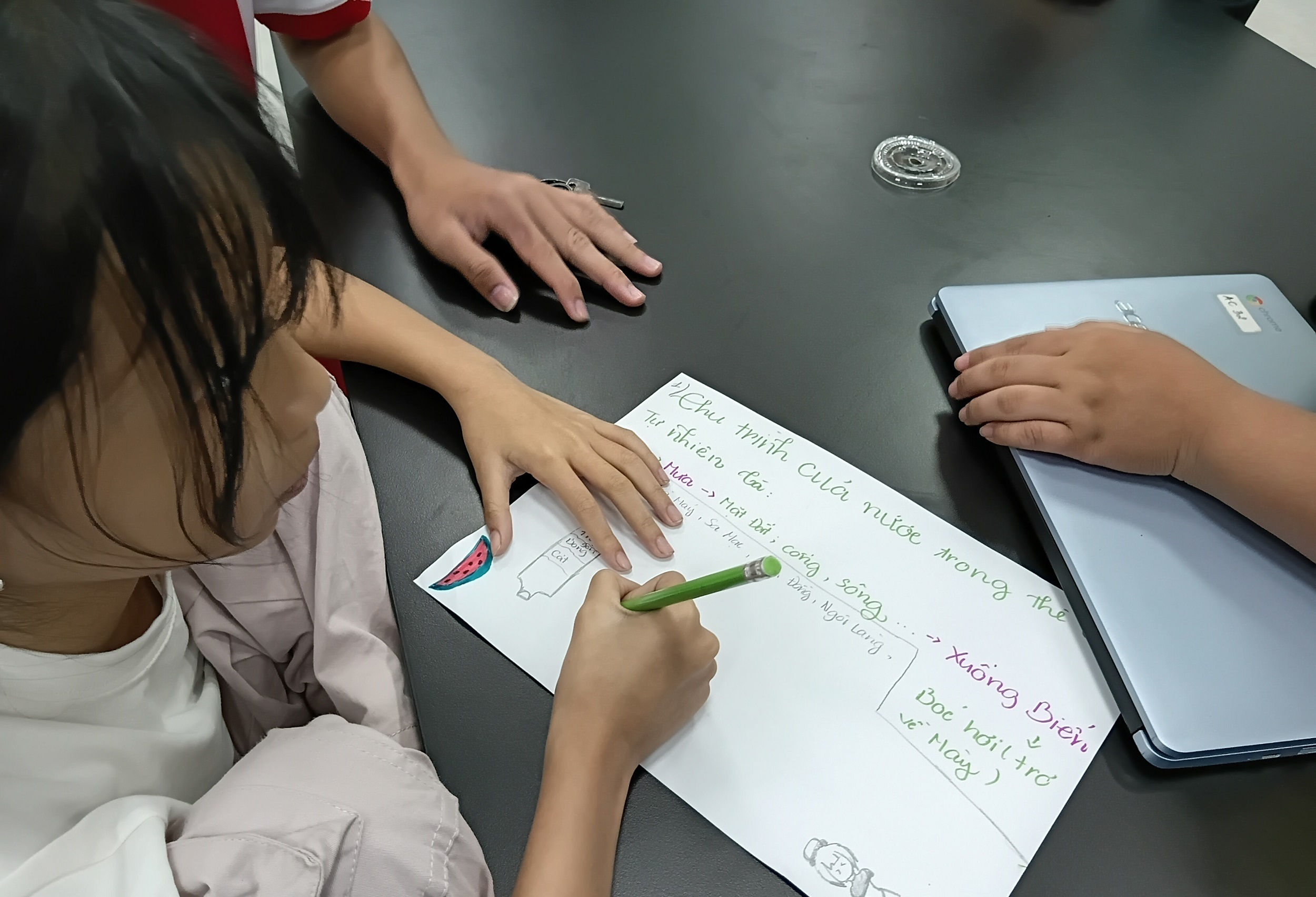 Đặc biệt, sau khi xem phim, các em đã cùng giải đố trắc nghiệm trực tuyến; tham gia “Thử tài biến hóa” để “hô biến” bản thân theo các từ khóa “mưa”, “tảng băng”, “dòng sông”, “biển”, “mây”; cùng tham gia vào thí nghiệm làm máy lọc nước mini…