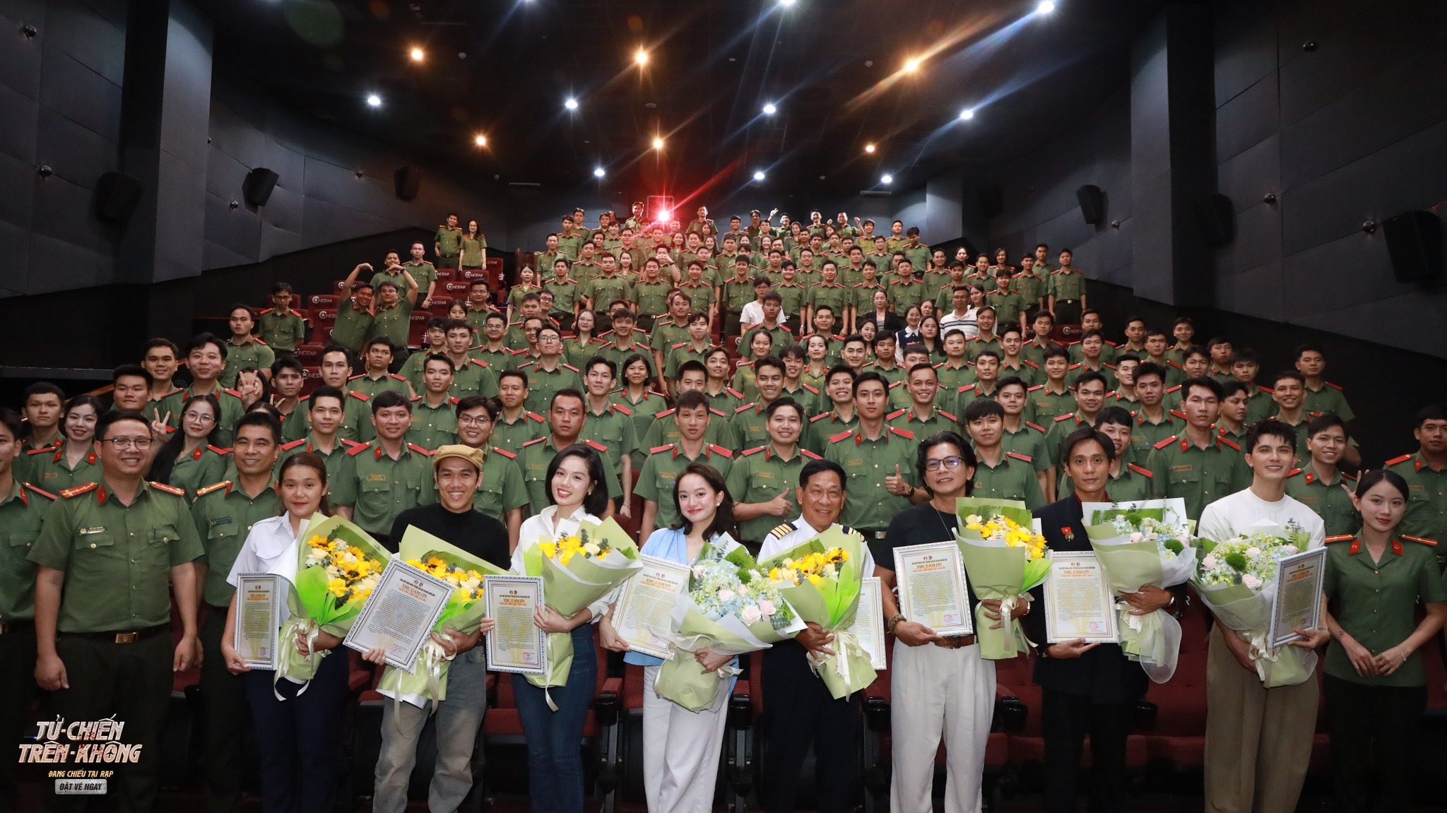 Đoàn phim ‘Tử chiến trên không’ tham gia chương trình sinh hoạt ngoại khóa giáo dục chính trị, tư tưởng chào mừng kỷ niệm 65 năm Ngày truyền thống Trường đại học An ninh nhân dân – Ảnh: ĐPCC